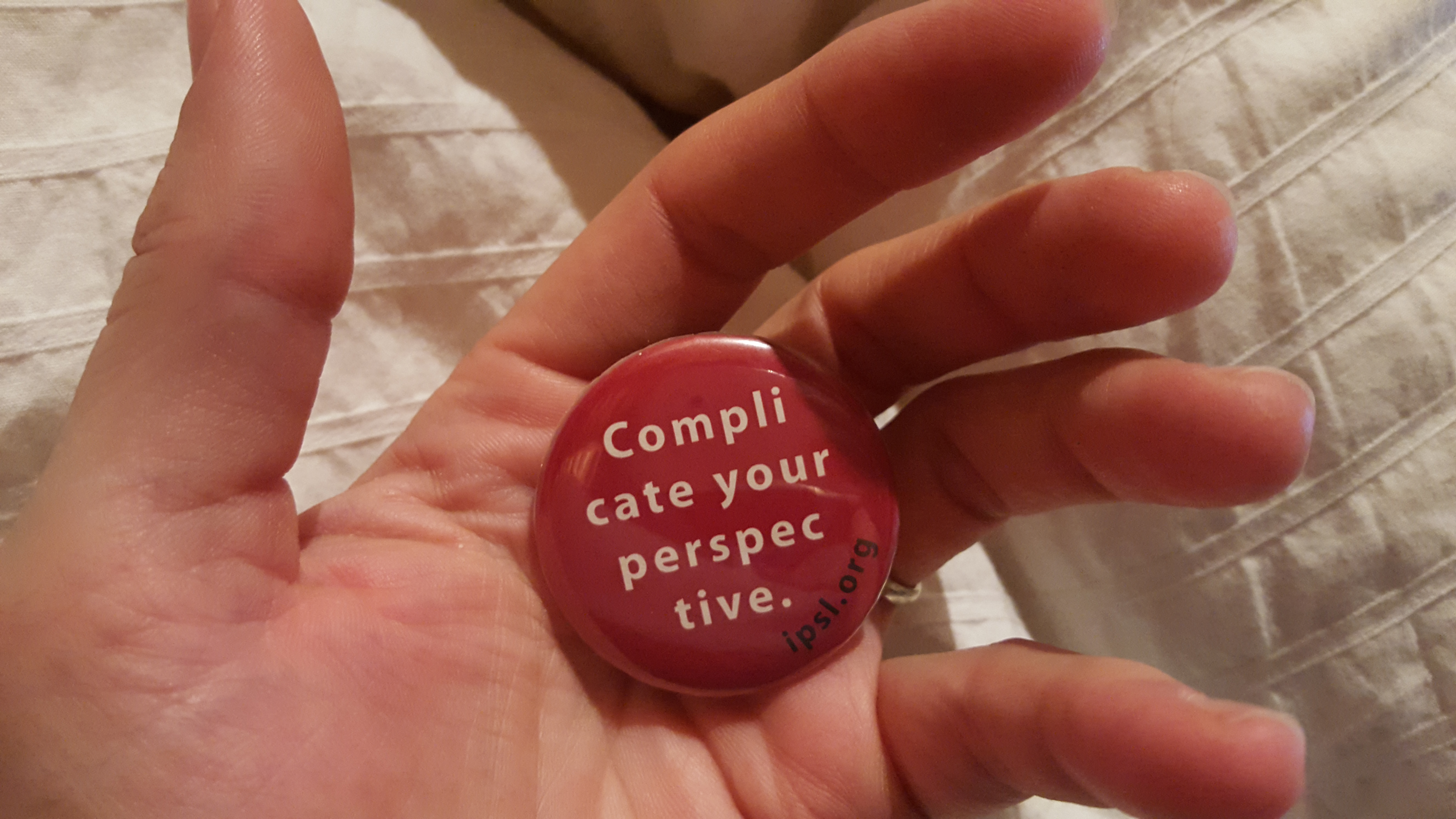 At that conference the organization gave out little promotional buttons and on them was written one a slogan that has since resonated with me and I believe always will. The button read “Complicate Your Perspective.” That motto has meant a lot to me, and is somehow comforting when life is confusing. A wider perspective is a positive and